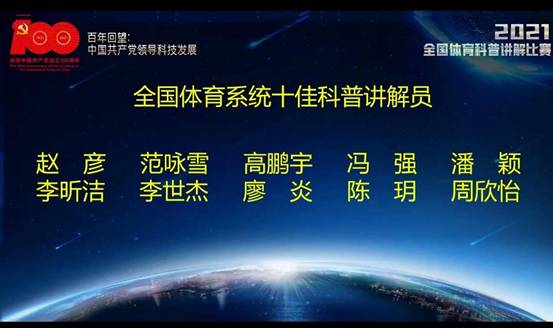 2021年8月27日,全国体育科普讲解比赛决赛圆满落幕,新闻专业范咏雪同学自我介绍、自命题讲解、随机讲解(20个主题中随机抽取)、科技常识问答四个环节的角逐,最终荣获“全国体育系统十佳科普讲解员”的称号,并将代表国家体育总局参加科技部于今年9月举办的2021年全国讲解大赛。