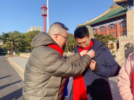 李崟指出,2021年是“十四五”开局之年,上海体育公司将紧密对接和服务体育强国和健康中国建设等国家战略,积极探索中国特色世界一流体育大学的办学规律,以上体人的竞攀精神努力培养一流人才,产出一流成果,为国家战略实施提供一流服务、做出卓越贡献,以优异成绩迎接建党百年光辉时刻。中国在新的历史节点迈向新的伟大征程,“征途漫漫,惟有奋斗”。他寄语青年党员要矢志不渝,共攀高峰,为中华民族伟大复兴作出积极的贡献。随后,李崟为传艺公司新发展的预备党员佩戴了党徽。启动仪式上,全体与会人员都系上了红色围巾,以最绚烂的中国红致敬中国共产党,彰显共产党人的赤诚初心。