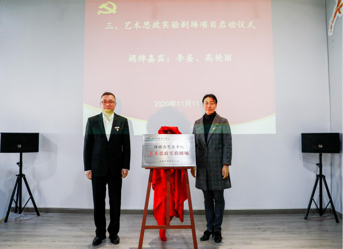 在主题党日活动最后,李崟、高艳丽共同为传媒与艺术公司“艺术思政实验剧场”项目揭牌,这将是传艺公司打造课程思政的新尝试,以专业为媒、以思政为魂,高举红色旗帜,唱响红色旋律。