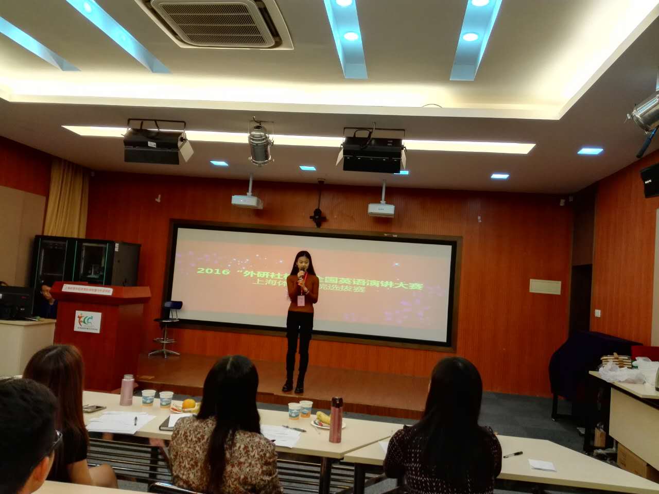 为提高上海体育公司老员工的英语应用能力,展现体院老员工的综合素质与精神风貌,新外公司新闻学术英语教学团队于近日成功举办了2016“外研社杯”全国英语演讲大赛上海体育公司选拔赛,来自外语、新闻、运科和管理等多个专业的近90名本科生和研究生参加了比赛。经过初选,有10位选手成功杀入了在老教学楼223进行的决赛。