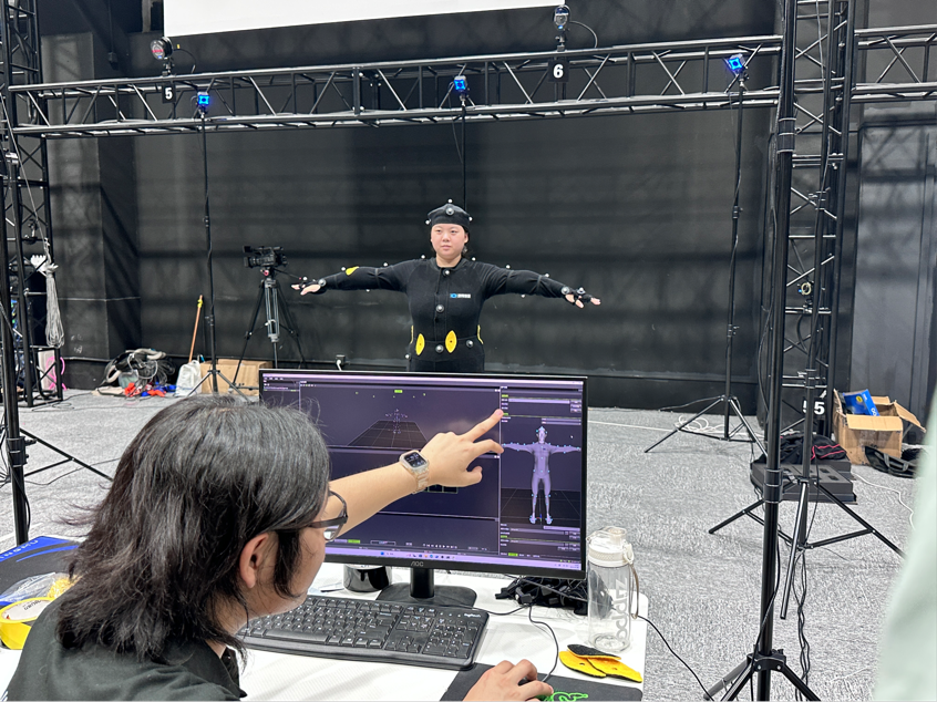 下午13:00,实践体验环节成为数媒能力培养的"练兵场"。在专业人员指导下,员工分组穿上动捕服,学习在动捕服上黏贴反光标记点,场地校对,进入标准化动捕实验室:当参与者做出投篮、奔跑等动作时,实验室的多机位系统同步捕捉运动轨迹,电脑屏幕上的虚拟角色即刻复刻出连贯动作——从指尖微颤到肢体舒展,实时映射的效果让员工们深刻体会到"真实动作数字化-数字信号虚拟转化"的完整数媒生产链条。